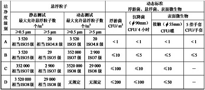 生產區的潔凈區分為A、B、C、D 4個級別,各個區域 潔凈度采納G際標準ISO 14644-1,明確占用狀態下不同關注粒徑時的**大濃度限值。