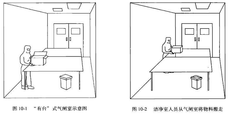 3) 氣閘室充分自凈:讓氣閘室處在無人狀態下數分鐘的時間,以便將污染降**這樣 的濃度:當潔凈室一邊的門打開時,潔凈室不會受到大的影響。為實現這一目的,可安裝 內外門的聯鎖計時裝置或指示燈。當潔凈室側門自動打開或指示燈點亮后,潔凈室的人員 進人氣閘室,拿起物品后離開氣閘室,如圖10-2所示。
