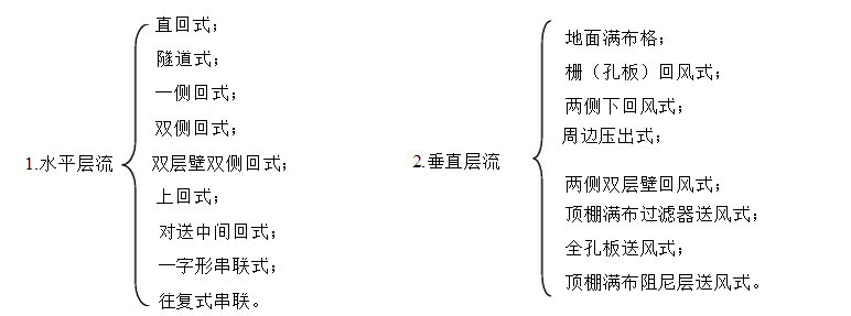 1.有些層流(筆直式,水平式) 2.亂流加潔凈作業臺式 3.亂流加有些層流式 4.作業臺地道式 5.地道潔凈室式 6.潔凈管道式