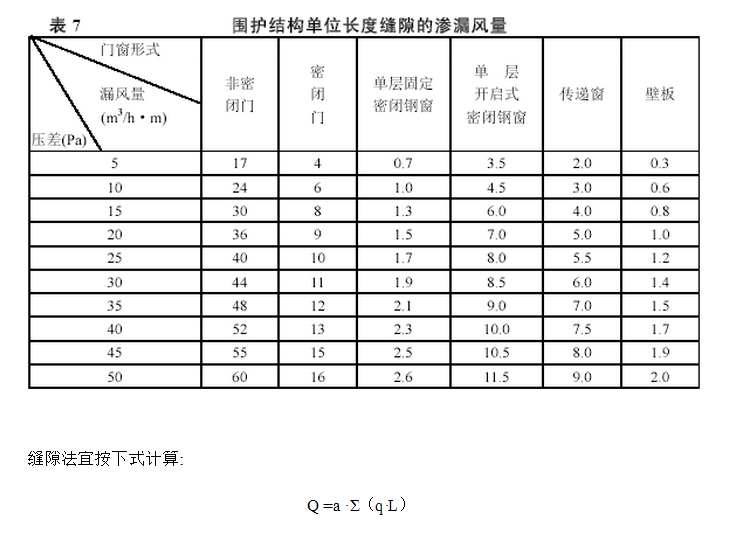 1 選用縫隙法來核算滲漏風量,既思考了潔凈室圍護結構的氣密性,又思考了室內保持不一樣的壓差值所需的正壓風量。因而,縫隙法比按房間的換氣次數預算法較為合理和準確。 單位長度縫隙滲漏空氣量用公式核算是對比艱難的,一般是經過不一樣型式的門、窗進行屢次實驗的數據核算后得出的。表 7是對G內潔凈室的 20多種常用的門、窗在實驗室進行了很多的實驗,獲得的數據,盡管這些年潔凈室門窗的資料和型式有很大的開展,但現在還有有些潔凈室依然選用鋼制密封門窗。故表中數據仍可供規劃時參閱。