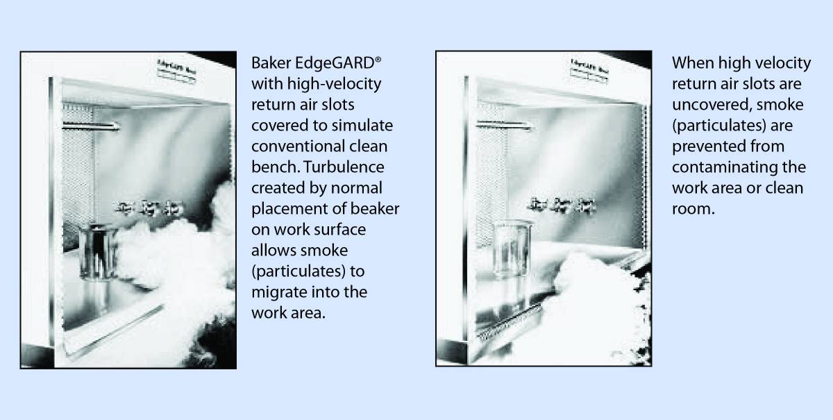 當(dāng)一個(gè)燒杯放置常規(guī)層流凈化臺的氣流中(示出,EdgeGARD®與覆蓋回風(fēng)槽),所得到的氣流中斷產(chǎn)生煙霧的回流進(jìn)入工作區(qū)。
